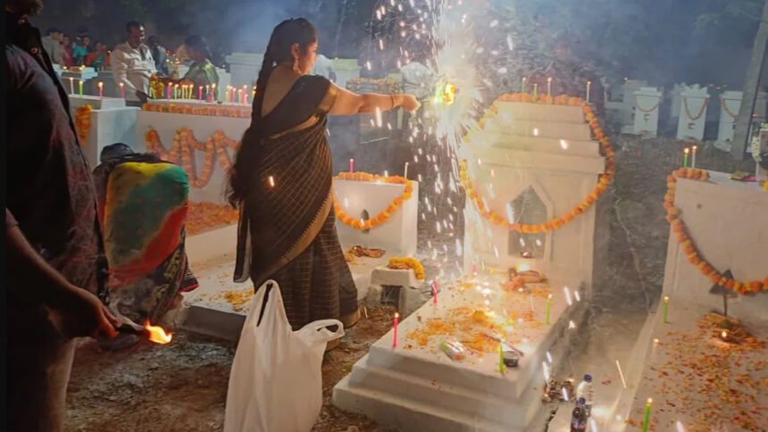 దీపావళి వేడుకలను ప్రజలంతా ఎంతో ఘనంగా జరుపుకుంటారు.దీపావళి పర్వదినం వేళ ప్రజలంతా భక్తి శ్రద్ధలతో లక్ష్మీదేవిని ఆరాధిస్తారు.ఏ ఇల్లు చూసినా దీపాలు, విద్యుత్ కాంతులతో అలంకరించి సంబరాలు చేసుకుంటారు. అయితే కరీంనగర్ లో ఆరు దశబ్దాలకు పైగా స్మశానంలోనే దీపావళి పండుగను జరుపుకునే సాంప్రదాయం కోనసాగుతుంది. పూర్వీకులను స్మరించుకుంటు.. తమ కుటుంబీకులను ఖననం చేసిన శ్మశాన వాటికలో సమాధుల వద్ద దీపాలు వెలిగించి వేడుక చేసుకుంటారు.